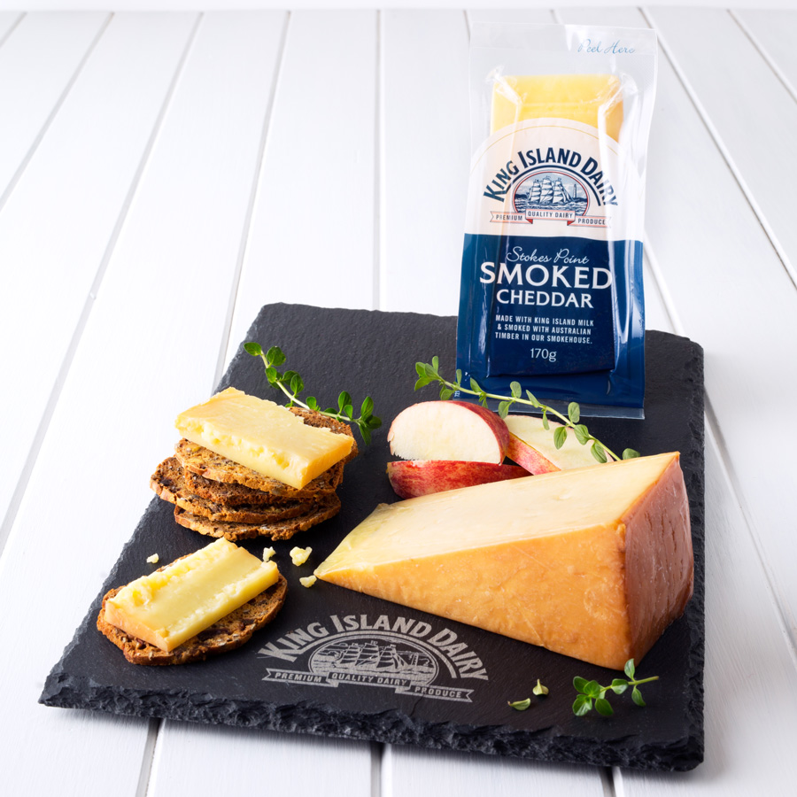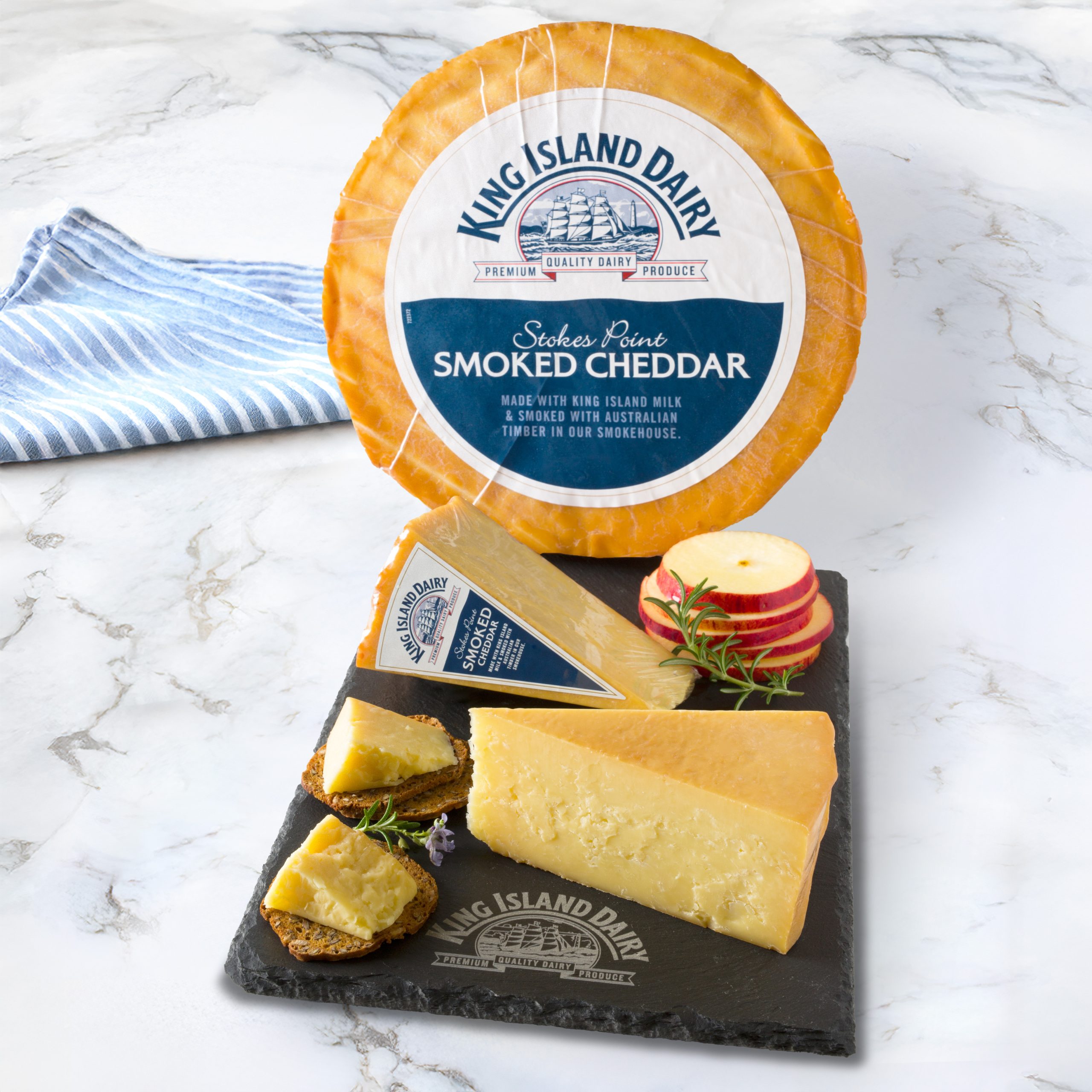 Stokes Point Smoked Cheddar is matured for a minimum of 9 months and then naturally wood smoked using a blend of Australian hardwood to impart a deep smoky aroma and flavour tones, balanced perfectly with its creamy cheddar centre.